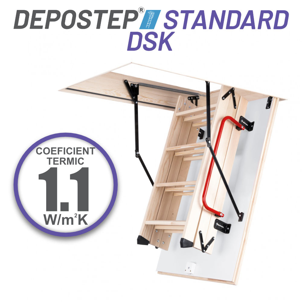 DEPOSTEP STANDARD DSK este o scara de pod modulara din lemn de pin cu usa termoizolanta tip sandwich, mansoane de protectie si maner de sustinere.