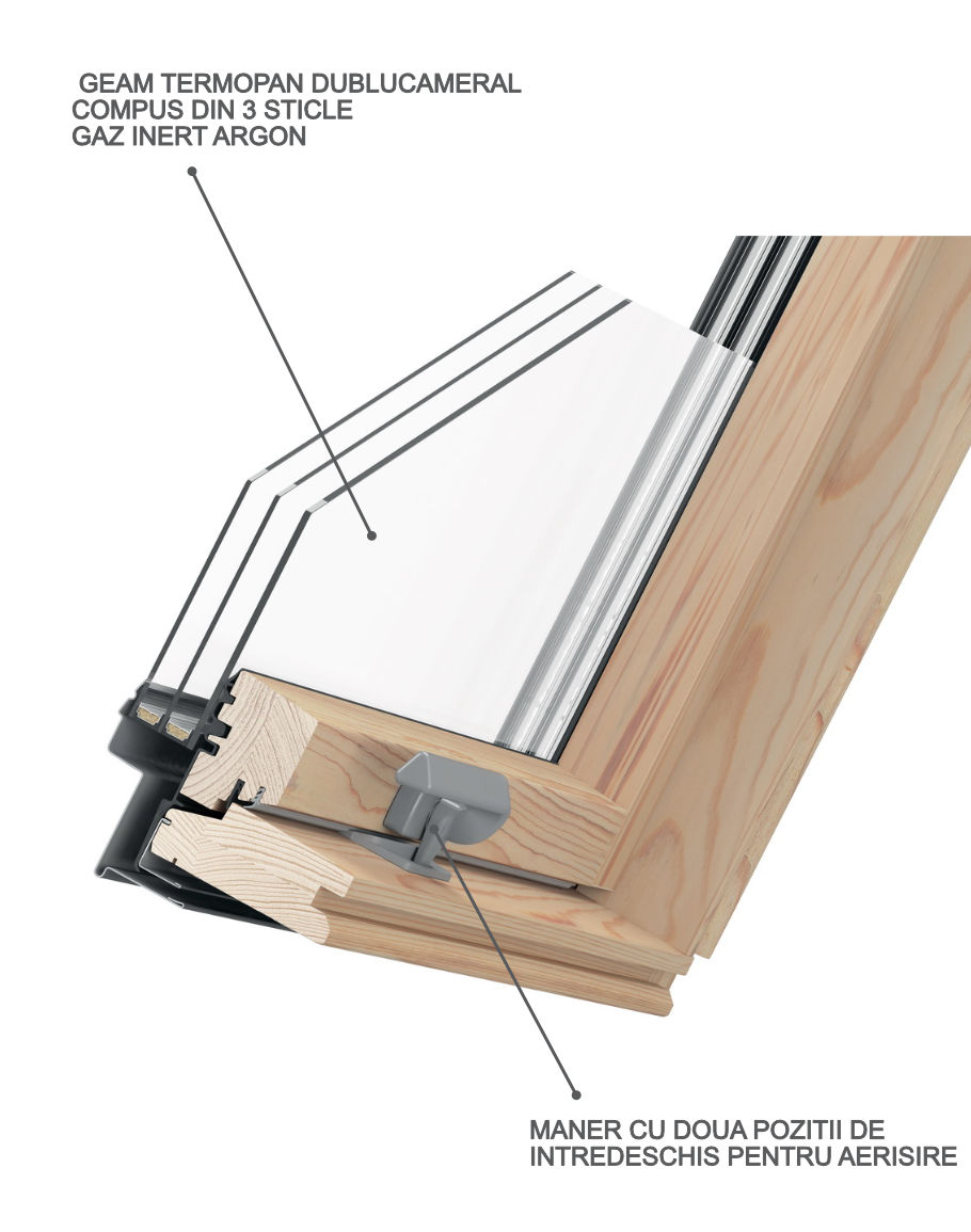 • Standard Plus: Ferestre echipate cu geam termoizolant din 3 foi de sticlă, sistem ThermoTechnology™ și garnitură suplimentară pentru etanșare.