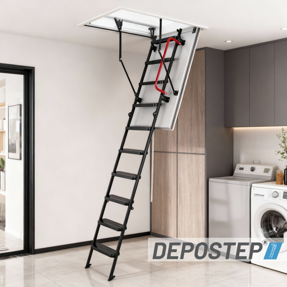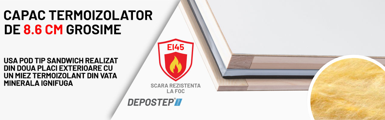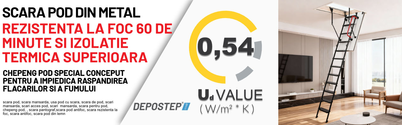 Modelul Scara Pod Metalica Antifoc DEPOSTEP AEI 60 M beneficiaza de o trapa termoizolanta de 6.6 cm grosime si de trei garnituri periferice, dintre care una ignifuga expansiva. Aceasta tehnologie se activeaza automat in caz de incendiu, blocand complet trecerea flacarilor, fumului si gazelor fierbinti catre nivelurile superioare. Coeficientul de transfer termic de 0.54 W/m²K contribuie la reducerea pierderilor de caldura si la imbunatatirea confortului termic al incaperii.