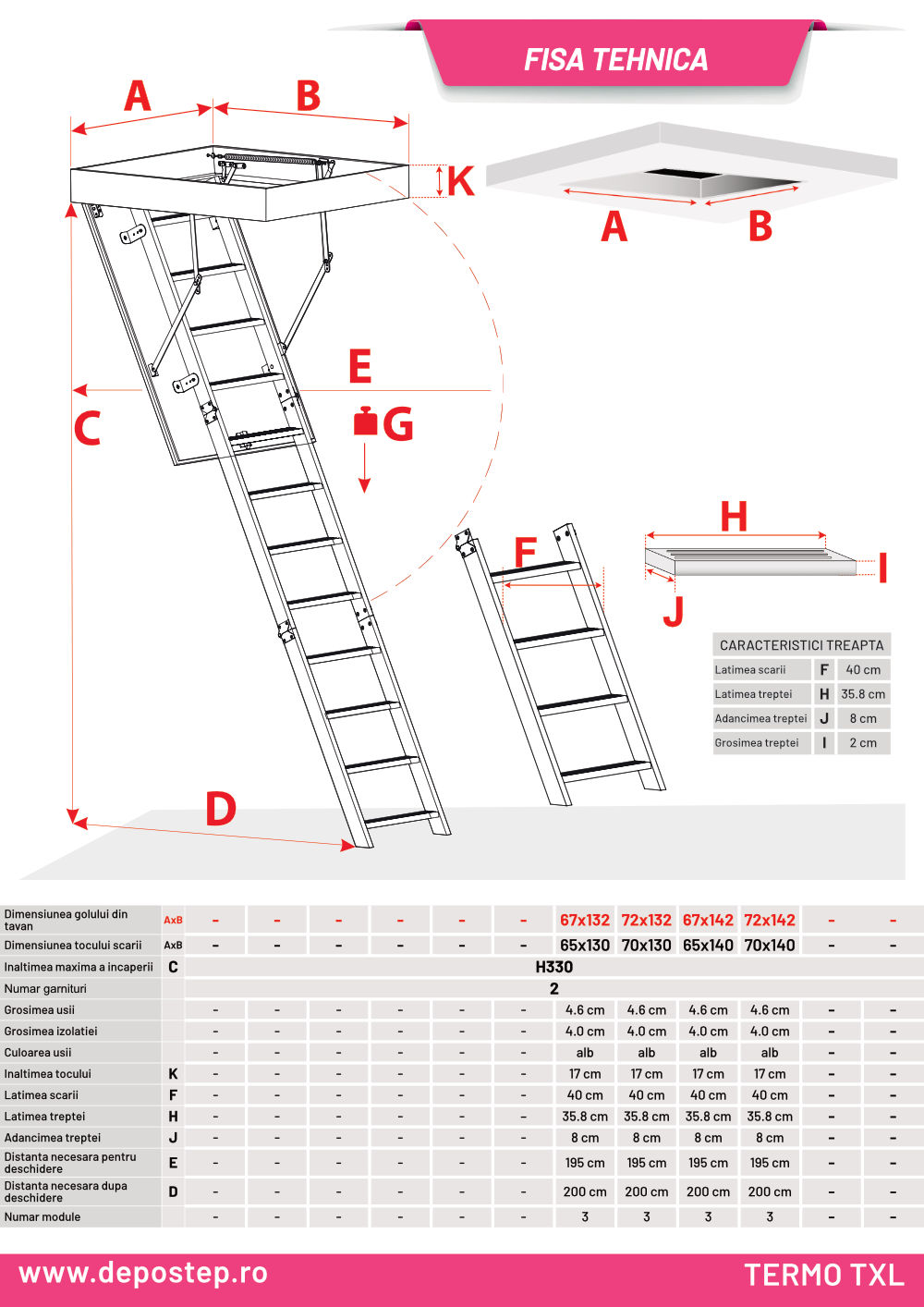 Cu o capacitate de extindere pana la 330 cm, scara pod DEPOSTEP TERMO TXL este recomandata pentru spatii rezidentiale, case cu etaj, mansarde sau poduri cu tavan inalt. Este o solutie practica si eficienta pentru accesul regulat sau ocazional la spatiile de depozitare superioare.