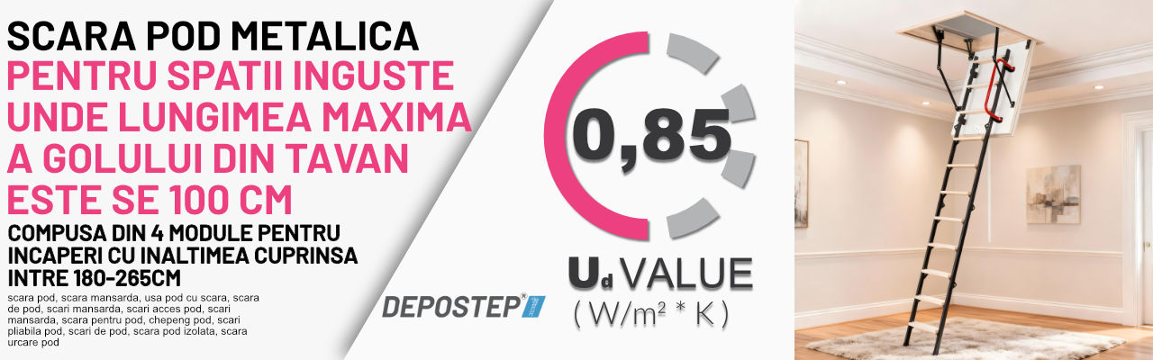 Scara pod DEPOSTEP MINI SPECIAL MNS este solutia ideala pentru incaperile unde spatiul de montaj este redus, iar golul din tavan nu permite instalarea unor scari cu toc lung, mai mari de 100 cm. Proiectata pentru incaperi cu inaltimea cuprinsa intre 180 si 265 cm, aceasta scara compacta pe 4 module ofera un acces sigur, confortabil si eficient catre pod. Este realizata din lemn de pin stratificat de calitate superioara si echipata cu un capac termoizolator de 4.6 cm (cu 4 cm izolatie), scara asigura performante termice bune si o utilizare stabila chiar si in spatii limitate. Garniturile duble de etansare contribuie la reducerea pierderilor de caldura, transformand modelul MNS intr-o solutie practica pentru incaperile mici sau coridoarele inguste.