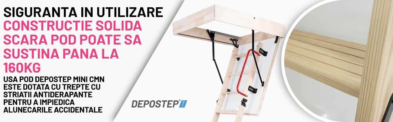 Scara Pod DEPOSTEP COMPACT MINI CMN asigura siguranta si confort la fiecare utilizare. Treptele late si antiderapante permit o urcare stabila, iar manerul de sustinere inclus imbunatateste echilibrul utilizatorului. Constructia compacta si rigida din lemn de pin stratificat garanteaza durabilitate in timp, in timp ce mansoanele de protectie previn deteriorarea podelei. Scara este silentioasa la operare, iar mecanismul de pliere permite manipularea chiar si in spatii inguste.