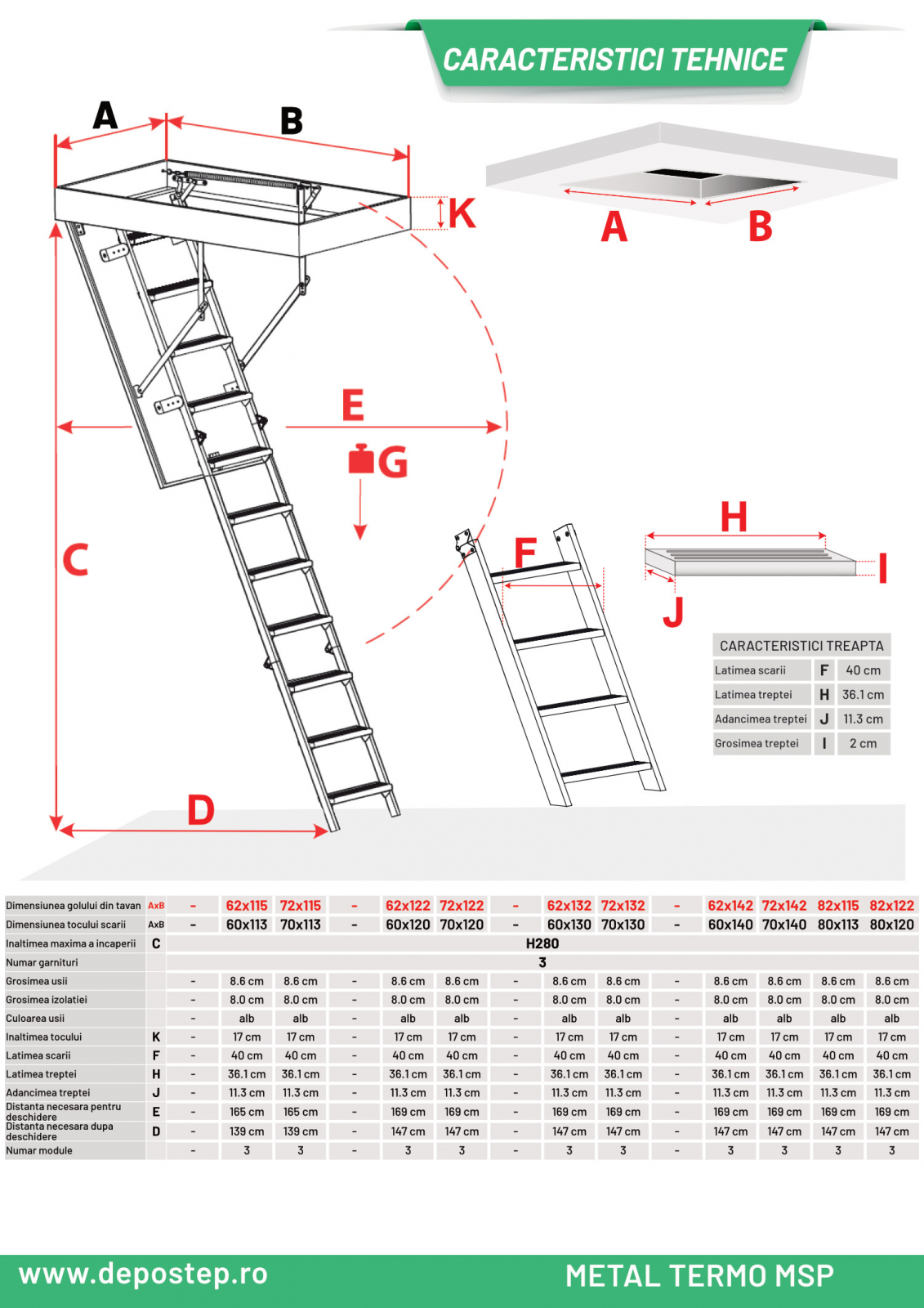DEPOSTEP TERMO METAL MSP este o scara pentru acces la pod, metalica, caracterizata prin cel mai bun coeficient de transmitanta termica de pe piata 0.36 W/m2k si cel mai inalt grad de etansare 4. Se obtin astfel economii considerabile de energie si caldura.