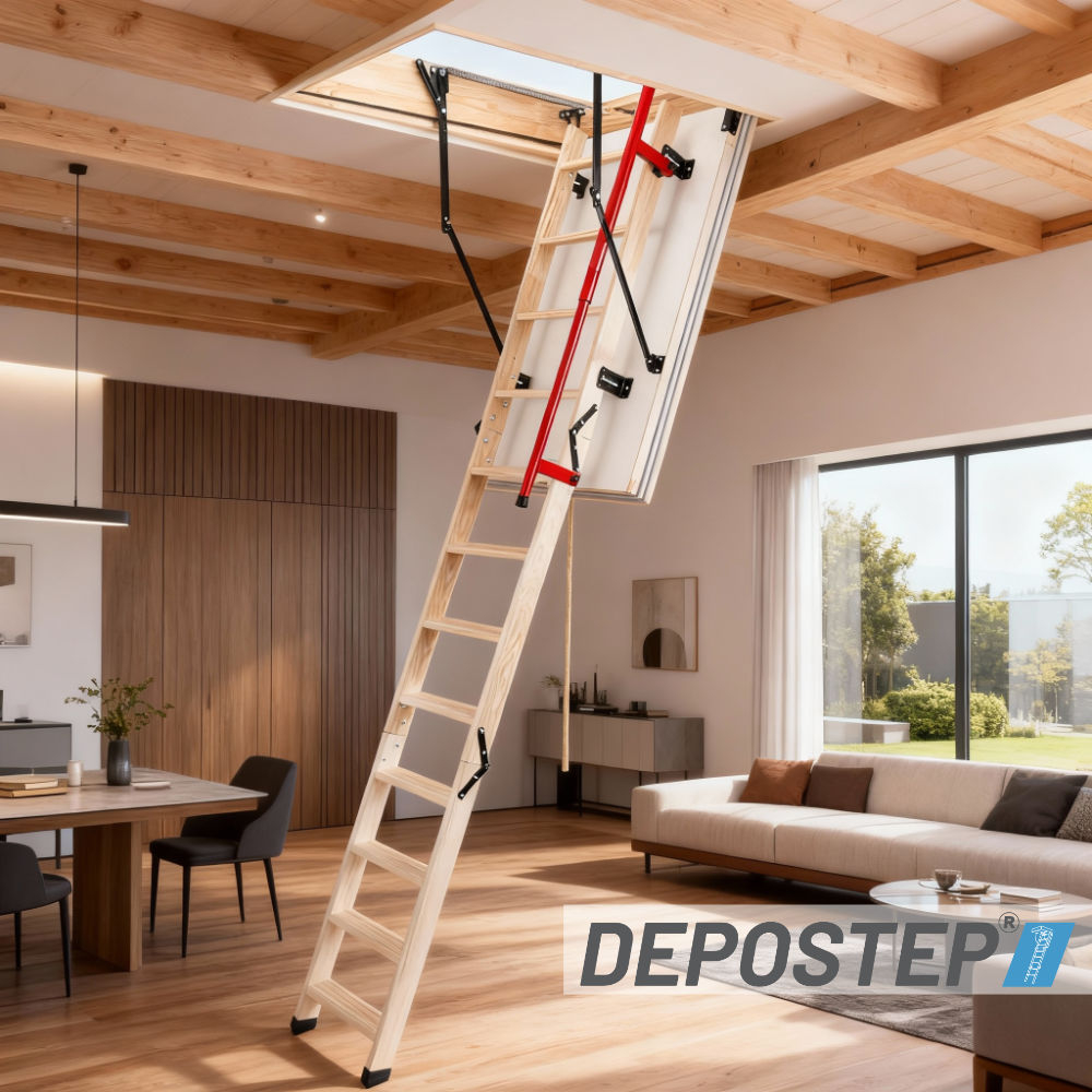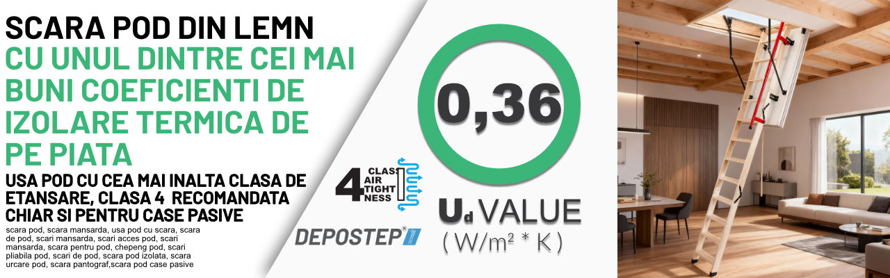 Scara pod DEPOSTEP SUPER TERMO SXL este o solutie premium destinata locuintelor unde izolatia termica superioara si confortul in utilizare reprezinta prioritati. Fabricata din lemn de pin natural de calitate inalta, aceasta scara ofera o izolatie exceptionala datorita capacului termoizolant de 8.6 cm si a celor trei garnituri periferice. Cu un coeficient U impresionant de 0.36 W/m2K, SUPER TERMO SXL se incadreaza in standardele caselor pasive si este potrivita pentru incaperi inalte de pana la 330 cm. Designul sau compact si elegant completeaza perfect interioarele moderne, oferind acces sigur si eficient la pod.