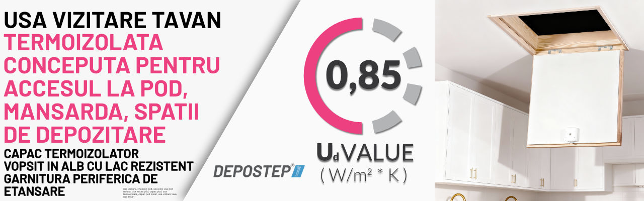 Usa vizitare tavan DEPOSTEP WS EXTRA este o trapa vizitare care se caracterizeaza printr-un toc din lemn masiv cu grosimea de 3 cm, o garnitura periferica de etansare si o usa termoizolatoare de 4.6cm grosime din care 4cm o constituie izolatia.